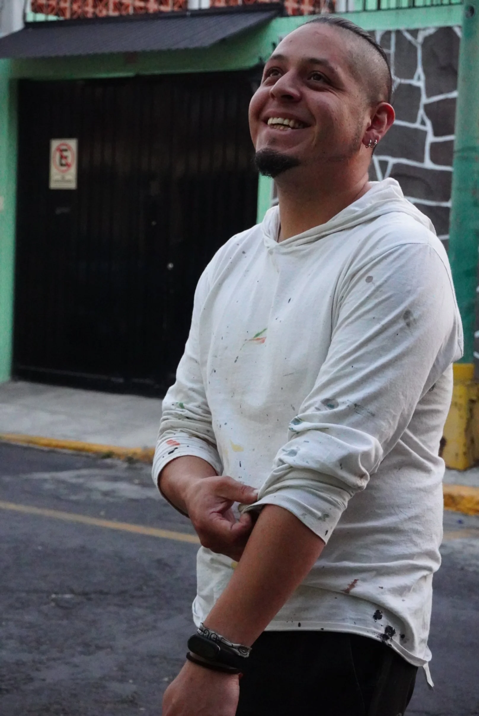 Me comuniqué con él por Instagram y al cabo de unos días volví con preguntas para documentar el encuentro. La solitaria calle resonaba con eco notas de un blues melancólico al estilo de Nina Simone, que rumoraba desde antes que diera vuelta a la esquina. El encuentro esta vez fue incluso afectuoso, sentada a un lado acompañaba Alex (hathor.alex), ilustradora, muralista y tatuadora, la confianza fluyó entre los tres. Bajó el volumen de la bocina y comenzamos con el diálogo