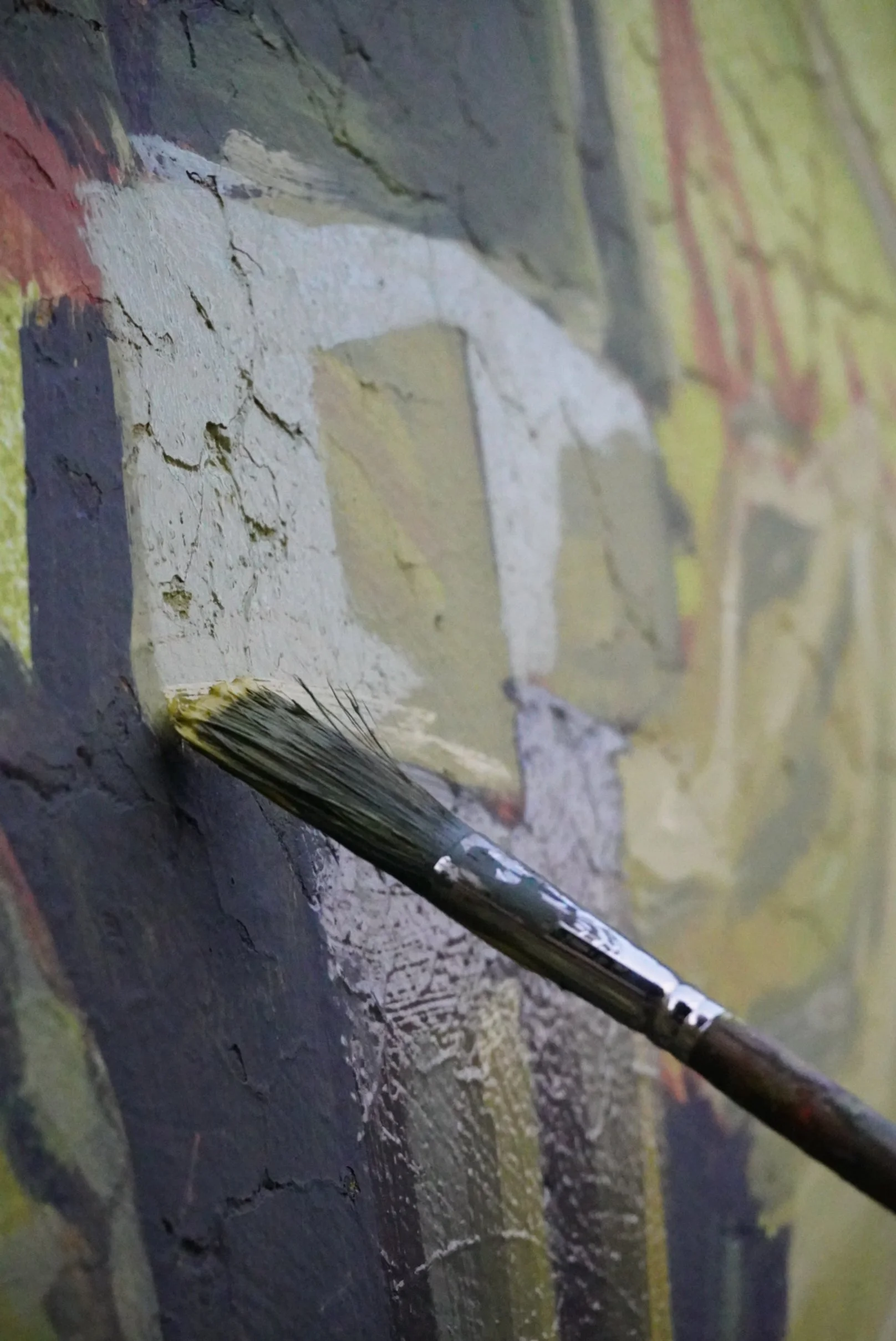 Lo que estoy representando es una madre tierra que está en una posición adolorida, recostada sobre su espalda en el concreto, se retuerce a sí misma y tiene en el vientre una espada pequeñita atravesándole sus costillas. Esta espada es una espada romana, aún no tiene nada escrito, pero va a llevar ahí unas letras en latín de un nombre, toda su falda que es lo que se extiende a más de la mitad del muro. Está representando como las plantas, el musgo. De alguna forma el color del color verde de la naturaleza y está llena de basura. Los colores de las luces y las sombras empiezan a generar una suerte de objetos como autos, cajas, animales abandonados, plásticos, ropa fast fashion, comida rápida, niños abandonados en la calle y que se quedan a su suerte empiezan a buscar alimentos o algo para vender, algunos otros objetos más extraños como drones de guerra, zapatos de coleccionista, libros como bíblicos, basura espacial.